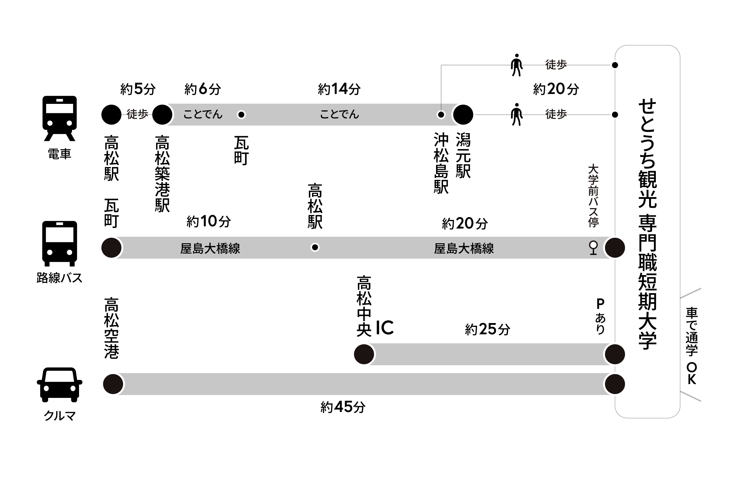 せとうち観光専門職短期大学へは、高松市内から複数の交通手段でスムーズにアクセスできます。高松駅・ことでん高松築港駅からは高松駅バスターミナルから屋島大橋線バスで約20分、ことでん瓦町駅からは同じく瓦町駅バスターミナルから屋島大橋線バスで約30分で到着します。また、ことでん沖松島駅・潟元駅からは徒歩約20分と、最寄駅から歩いてアクセスすることも可能です。お車をご利用の場合は、高松中央ICから約25分、高松空港からは車で約45分と、県内外から訪れやすい立地にあります。