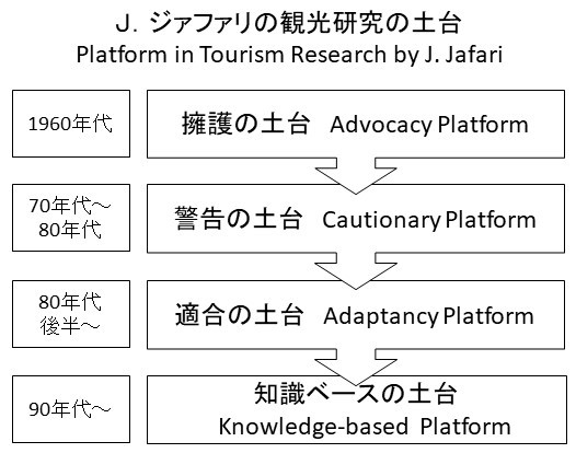 この観光研究の土台というアイディアは、ジャファリが観光研究の文献を整理する枠組みとして生みだされました。後にこの枠組みは、観光研究の動向を整理するためにも用いられています。文献を整理した当初、観光研究の土台は、必ずしも一定の期間に区切られるものではない、とジャファリは考えましたが、それでも、概ね、一定期間ごとの観光研究の動向が特徴づけられています。