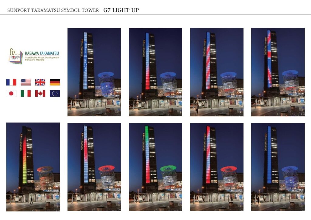 令和5(2023)年5月19日~21日、広島でG7サミットが開催されました。瀬戸内海を臨む高松では、7月に都市大臣会合が開かれました。その50日前のサミット前日から、高松シンボルタワーのG7ライトアップが始まりました。