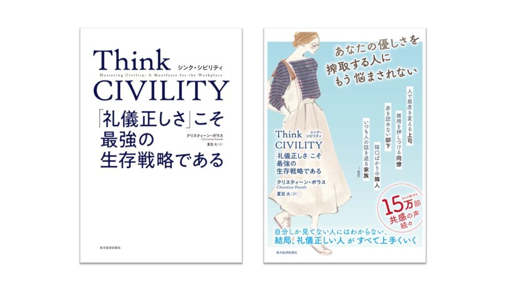 クリスティーン・ポラス,夏目大(訳)2019『Think CIVILITY「礼儀正しさ」こそ最強の生存戦略である』東洋経済新報社 表紙(左)・表紙帯(右)(最新版) 表紙写真は出版社:東洋経済新報社より掲載許可を得ています。