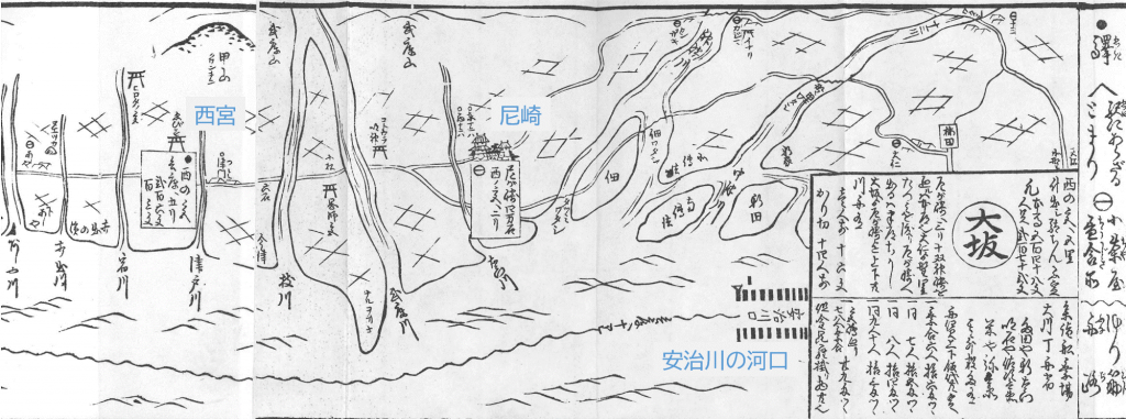では、もう少し詳しく中身をみていきたいと思います。この案内記は、大坂から始まります。こんぴらへの参詣船の乗り場が示され(大川丁船宿)、船賃は乗船人数によって決められていたことが記されています。6人で乗ると一人16匁、9~10人で乗ると13匁になりました。図は、大坂の安治川河口から始まり、尼崎、西宮、須磨といった沿岸部の地名や、周辺の名所が示されています(図1)。江戸時代には『平家物語』が流行し、とくに関連する名所旧跡の多い須磨には、多くの旅人たちが立ち寄りました。その名所旧跡の一部である、一の谷や平敦盛の石塔もちゃんと図中に確認することができます。