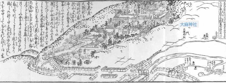 こんぴらさんの門前町まで到達すると、金倉川に架かる鞘橋と、その先に続く参道、そしてこんぴらさんの境内の様子が描かれています(図4)。図の左側にあるのは、金毘羅大権現の由来と、門前町や境内の周辺の様子、堂塔の説明です。そして最後には、高松へ船を着けさせた場合の陸路を使ったこんぴらさんへの参詣路が紹介されています。