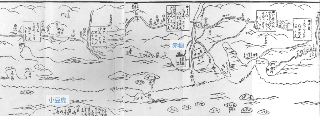 須磨を過ぎると明石城の姿が見え、その向かいには淡路島の北端が描かれています。現在は明石海峡大橋が架かっているところです。『金毘羅参詣海陸記』では、そのまま瀬戸内海を西へと進み、姫路、赤穂を過ぎ、家島諸島を通過したところで、南に小豆島が見えてきます(図2)。