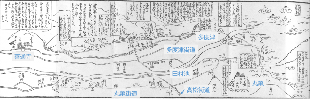 多度津街道の上部(方向としては西)には、道隆寺、弥谷寺、曼荼羅寺、出釈迦寺、甲山寺、善通寺、和光寺、大麻神社といった寺社が描きこまれており、丸亀街道のほうにも吉田社や八幡社といった神社のほかに、田村池や「コンヒラヘ五十丁」といった道標があることが示されています。これらは、名所や見所としての意味合いと、道しるべとしてのランドマークであったと捉えることができます。