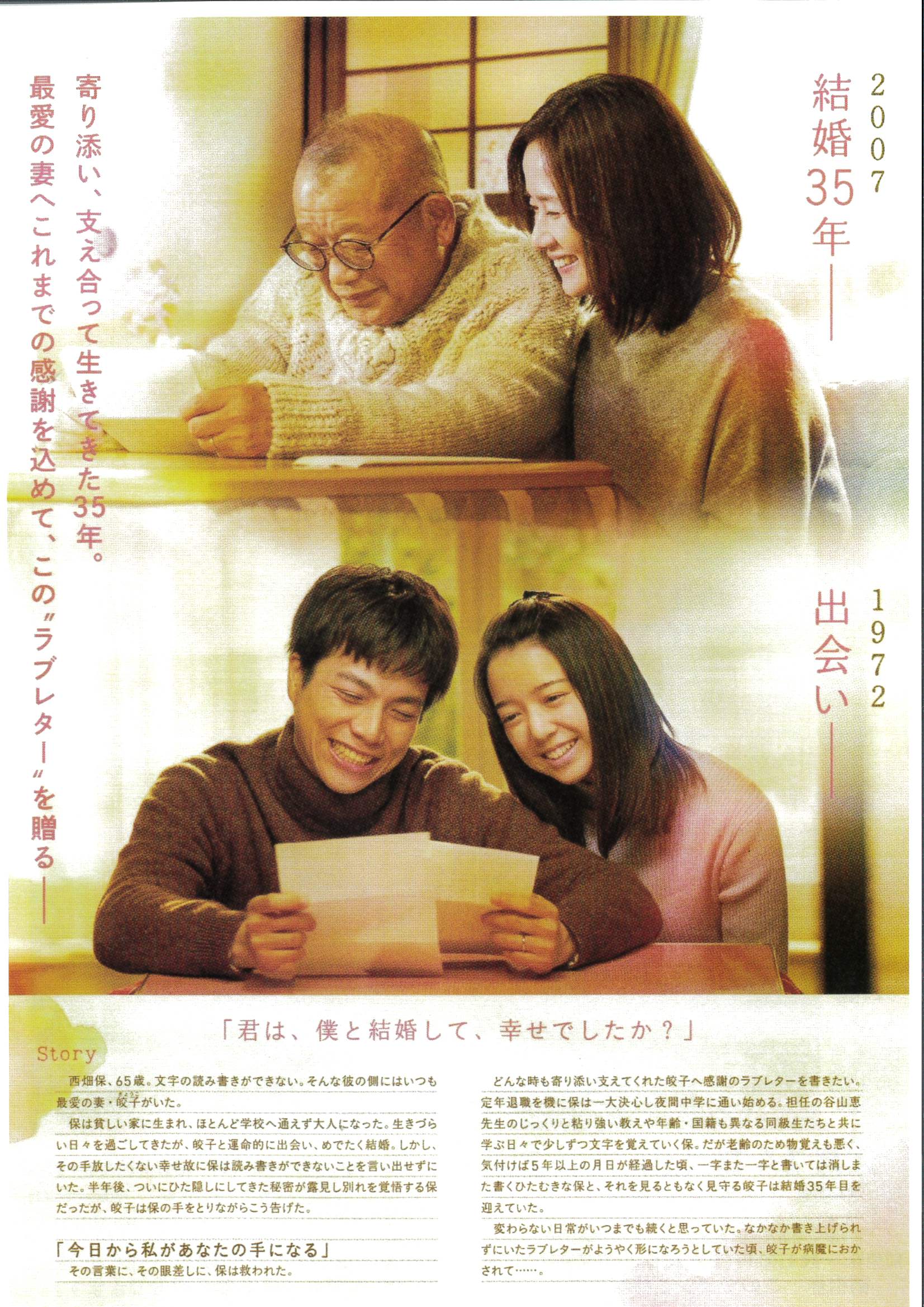 笑福亭鶴瓶と原田知世が夫婦役を演じ、最愛の妻にラブレターを書くために文字の勉強に奮闘する夫と、彼を長年支え続けた妻の人生をつづったヒューマンドラマ。2003年に朝日新聞で紹介され、創作落語にもなるなど話題を集めた実話をもとに映画化した作品です。