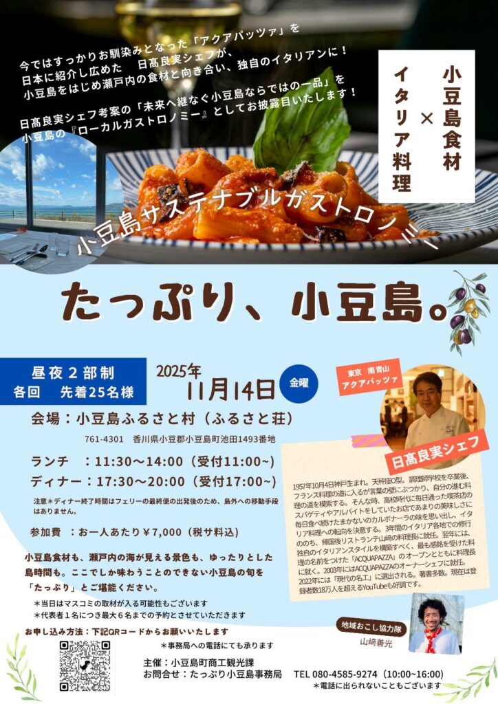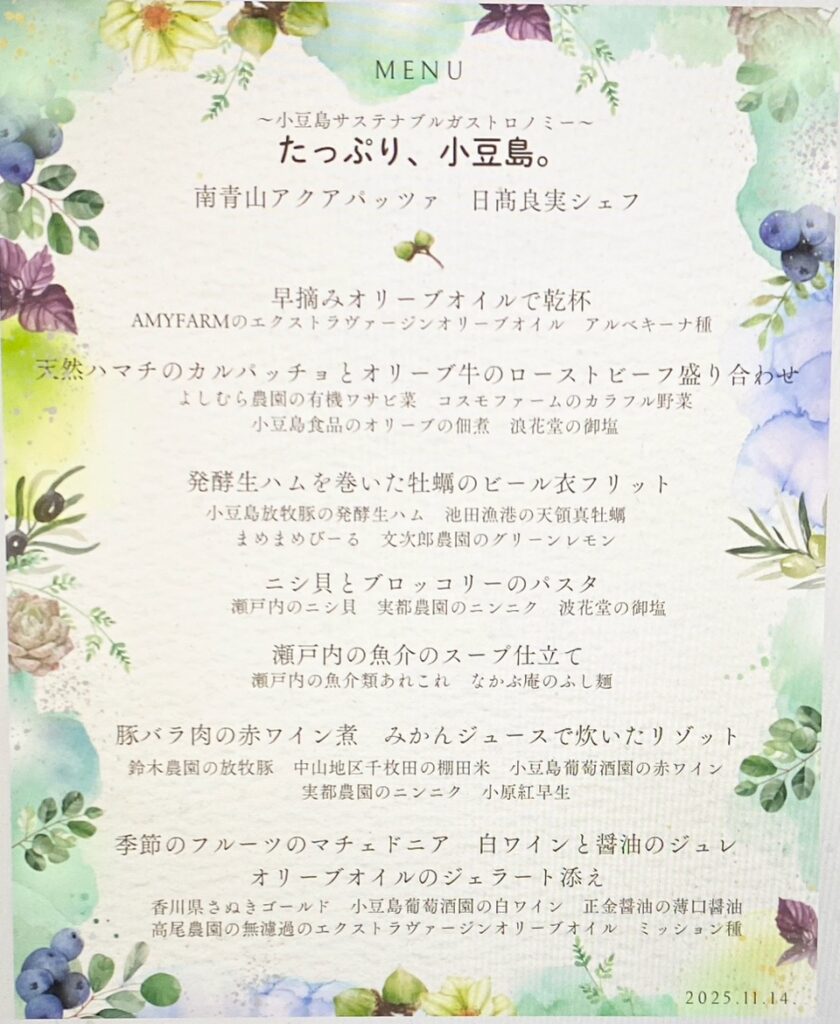 料理は今年2月の開催に続き、今回も「アクアパッツァ」を日本に紹介し広めた、日高良実シェフによるものです。日高シェフは、小豆島の食材を取り入れた「未来へつなぐ小豆島ならではの一品」を考案されました。