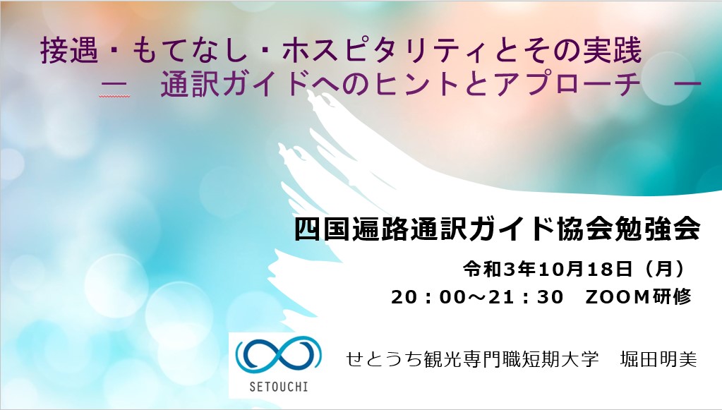 「接遇・おてなし・ホスピタリティとその実践 ― 通訳ガイドへのヒントとアプローチ ―」というテーマで、海外から四国遍路の体験に来られる方を案内する通訳ガイドの皆さんを対象に行われました。アフターコロナのインバウンド増加を見通した受け入れ準備が進んでいます。