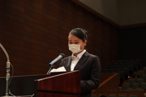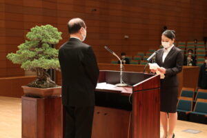 新入生宣誓では、新入生を代表して三好 琳音 さん(高松南高校出身)が、「ホテルのフロントで働くという夢に向かって、これからの3年間で観光振興のエキスパートとなるため、知識と実務をしっかり身につけたい」と決意を新たに宣誓しました。