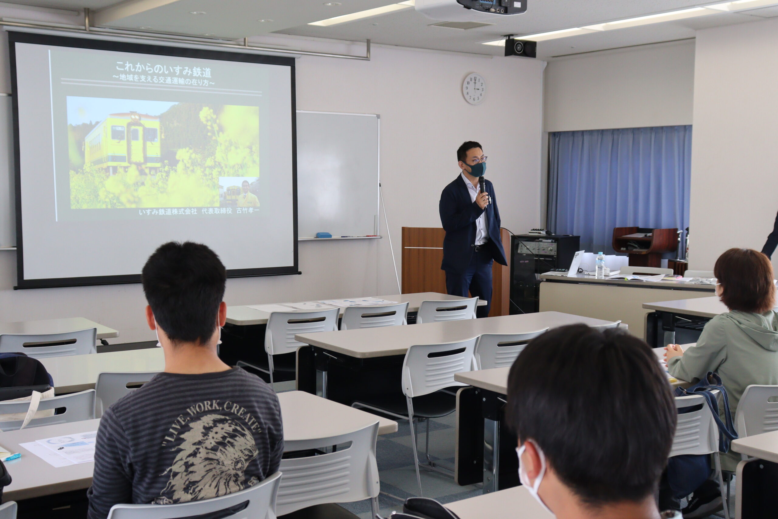 本日の「ホスピタリティマネジメント論」堀田准教授の授業にゲストスピーカーとして、いすみ鉄道株式会社(千葉県) 代表取締役社長 古竹 孝一 氏 が登壇されました。高松市出身の古竹社長から「これからのいすみ鉄道~地域を支える交通運輸の在り方~」というテーマで、受講した学生たちは真剣な表情で受講していました。