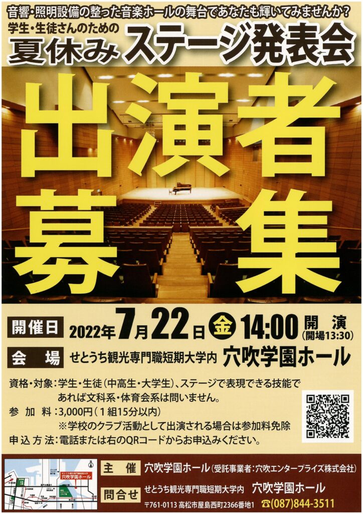 せとうち観光専門職短期大学の穴吹学園ホール(定員511人)で、日頃の練習の成果を発表してみませんか?