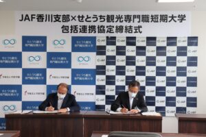 本日、せとうち観光専門職短期大学にて、JAF(一般社団法人日本自動車連盟)香川支部と本学との包括連携協定締結式を行いました。