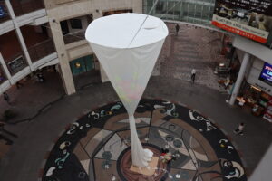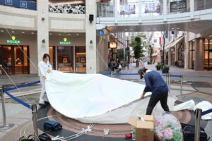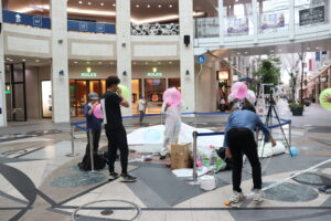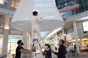 高松丸亀町商店街前ドーム広場に、現代美術家の金 孝妍さんが制作した巨大アート作品の設置作業をせと短学生の有志がお手伝いしました。