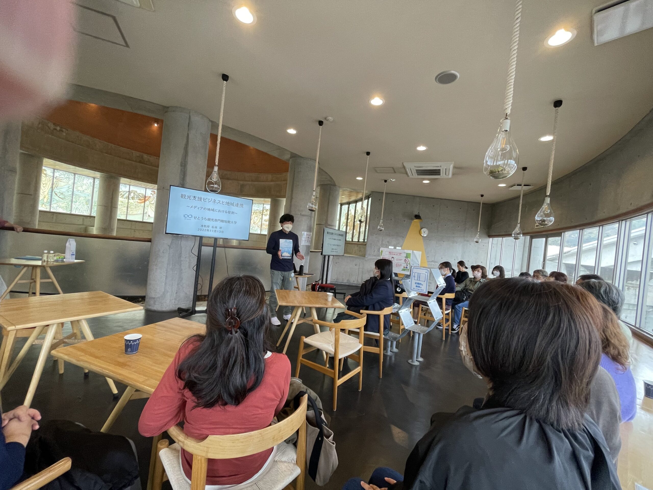 「観光支援ビジネスと地域連携~メディアの地域における役割~」というテーマで石床准教授(一社小豆島観光協会 前事務局長)がフィルムコミッションのもたらす影響などを講話