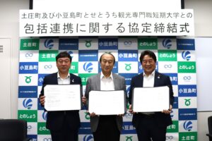2023年5月30日(火)に土庄町、小豆島町、せとうち観光専門職短期大学の三者間で「包括連携に関する協定」を締結いたしました。