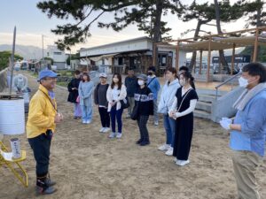 父母ヶ浜では「ちちぶの会」主催の清掃活動が毎月行われており、せとうちPRサークルのボランティア活動の一環として学生9名と教職員5名が参加しました。朝6時からの清掃活動ということで、4時過ぎに高松を出発しましたが、朝早くからの清掃活動はとても清々しい気持ちになりました。