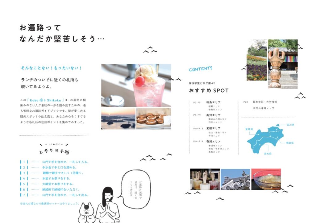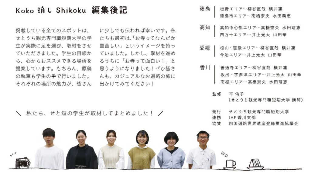 「Koko推しShikoku」は、四国お遍路を若者でも気軽に楽しめるよう、ガイドブック制作をせと短学生が行うプロジェクトとして昨年8月に立ち上がりました。平先生の呼びかけに6人の学生が手を挙げ、企画打ち合わせ、調査、取材先の選定、取材先への説明・アポイント、取材、撮影、紙面校正、Webページ校正など学生たちにとって初めての事ばかりでしたが、平先生監修のもと「Koko推しShikoku」が完成しました。「Koko推しShikoku」は、道の駅や観光スポット、掲載させてもらったお店などに置かせてもらっています。もちろんせと短にも置いているので、「Koko推しShikoku」を手に取ってカジュアルなお遍路に是非出かけてみてください。