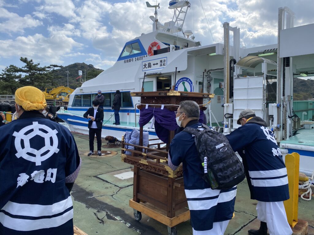 分解されたちょうさを船に積んで大島に上陸