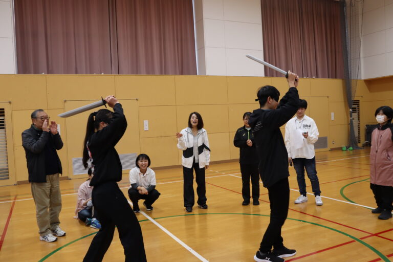 目隠しをした状態で周りからの指示を頼りに相手を切る「気配切り」は大盛り上がり