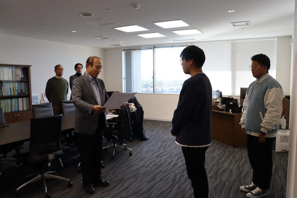 せと短主催の第2回目となる写真コンテストの学内表彰式を行い、入賞したせと短の学生2名を対象に学長から表彰状が贈られました。