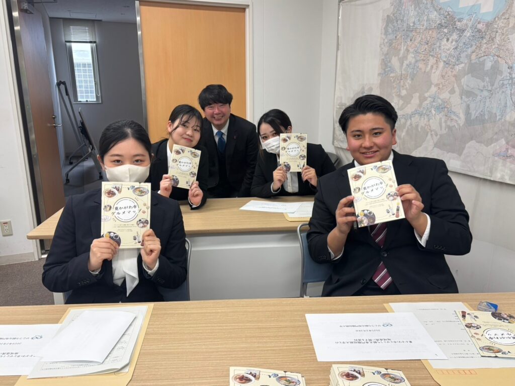 そのほか、観光冊子【東かがわ市グルメマップ】の制作も行い、協定締結式終了後、学生から市長と東かがわ市観光協会会長へ東かがわ市グルメマップの贈呈を行いました。