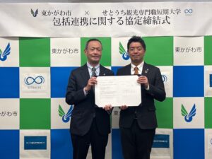 2/28(金)、東かがわ市(上村 一郎 市長)とせとうち観光専門職短期大学(安村 克己 学長)との間で地域観光振興に関する包括連携協定の締結式が、東かがわ市役所で行われました。
