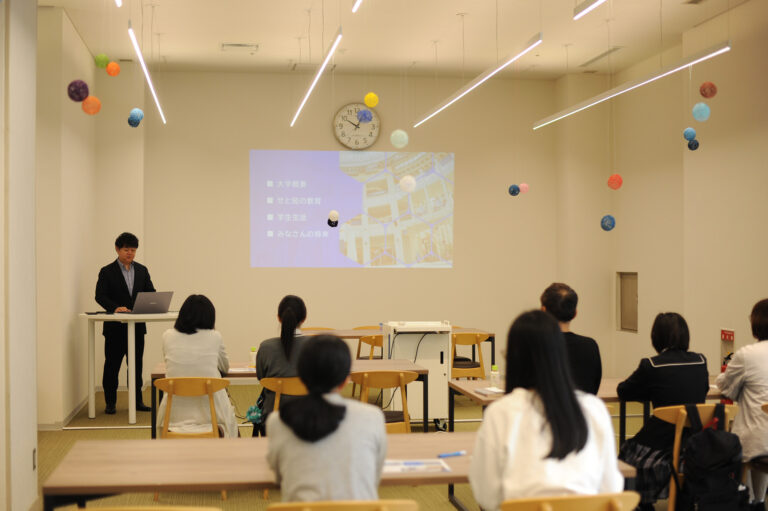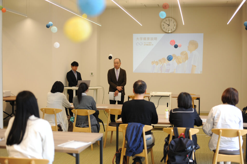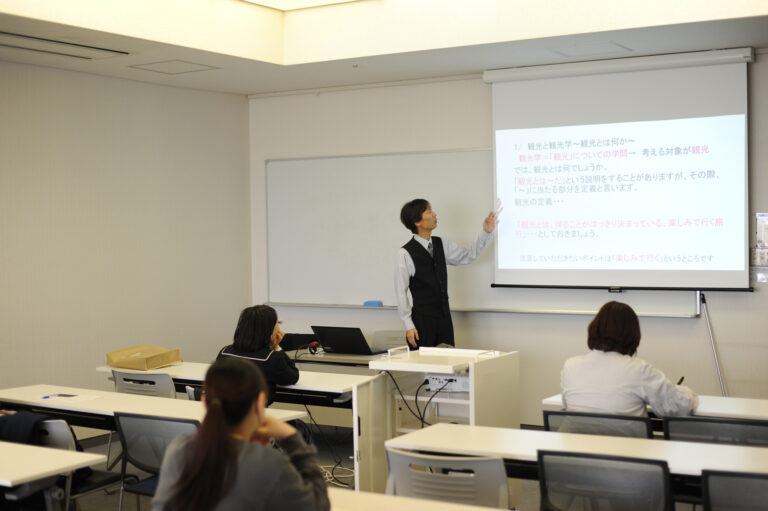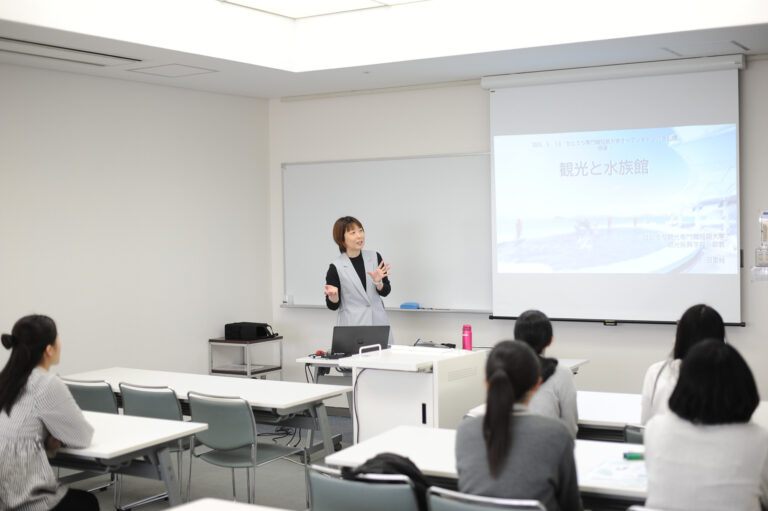 説明パートが終了後は、本日の体験授業紹介。2つの授業から選べるようになっており、今回は学術系として「観光学って何?」と、「観光と水族館」。それぞれの教員より30分弱ではありますが上級学校ならではの内容をお伝えいただきました。
