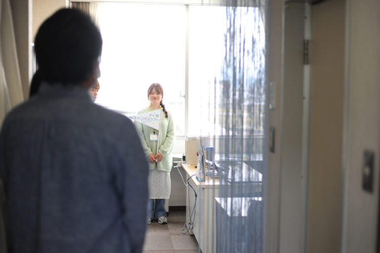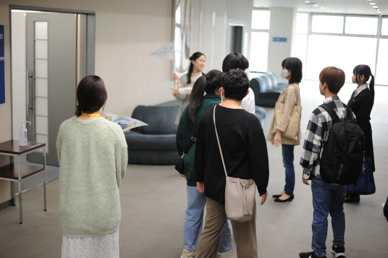 授業終了後は先輩が案内してくれる「キャンパスツアー」。コンパクトな校舎(キャンパスは瀬戸内海)ですが、どんな授業で使用するのかを説明します。