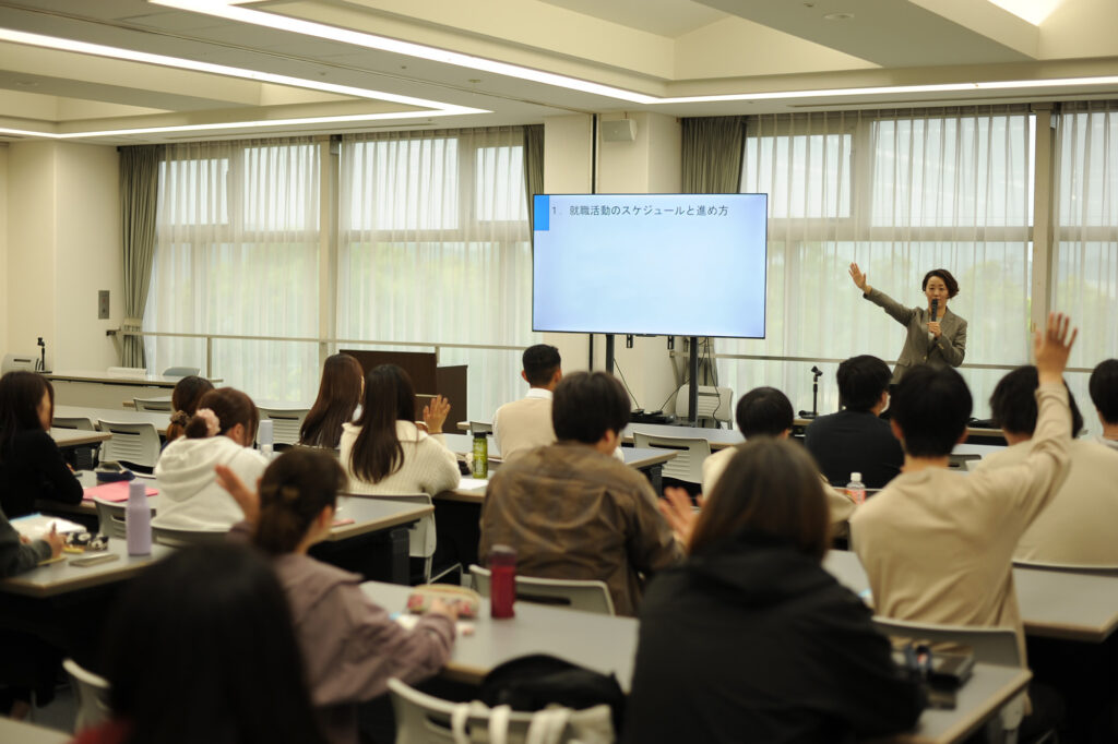 年々早期化する就職活動ですが、先日は2年生を対象に活動を始める前の流れについてキャリアセンター長の濵島先生より説明がありました。