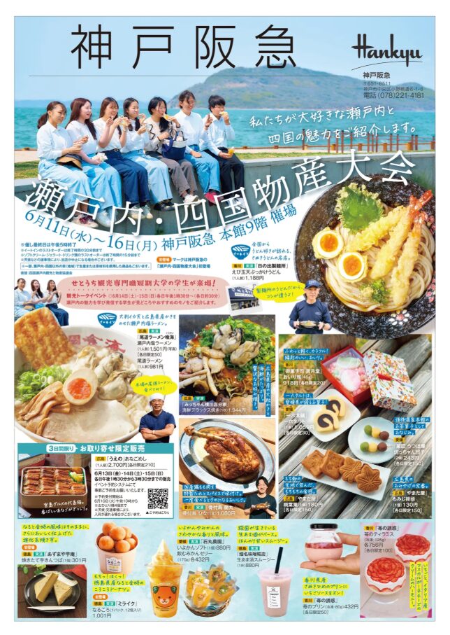 神戸阪急にて毎年開催されている「瀬戸内・四国物産大会」に四国、香川を代表する学校として本学の2・3年生希望者5名が販売サポートおよび観光トークイベントに参加します。
