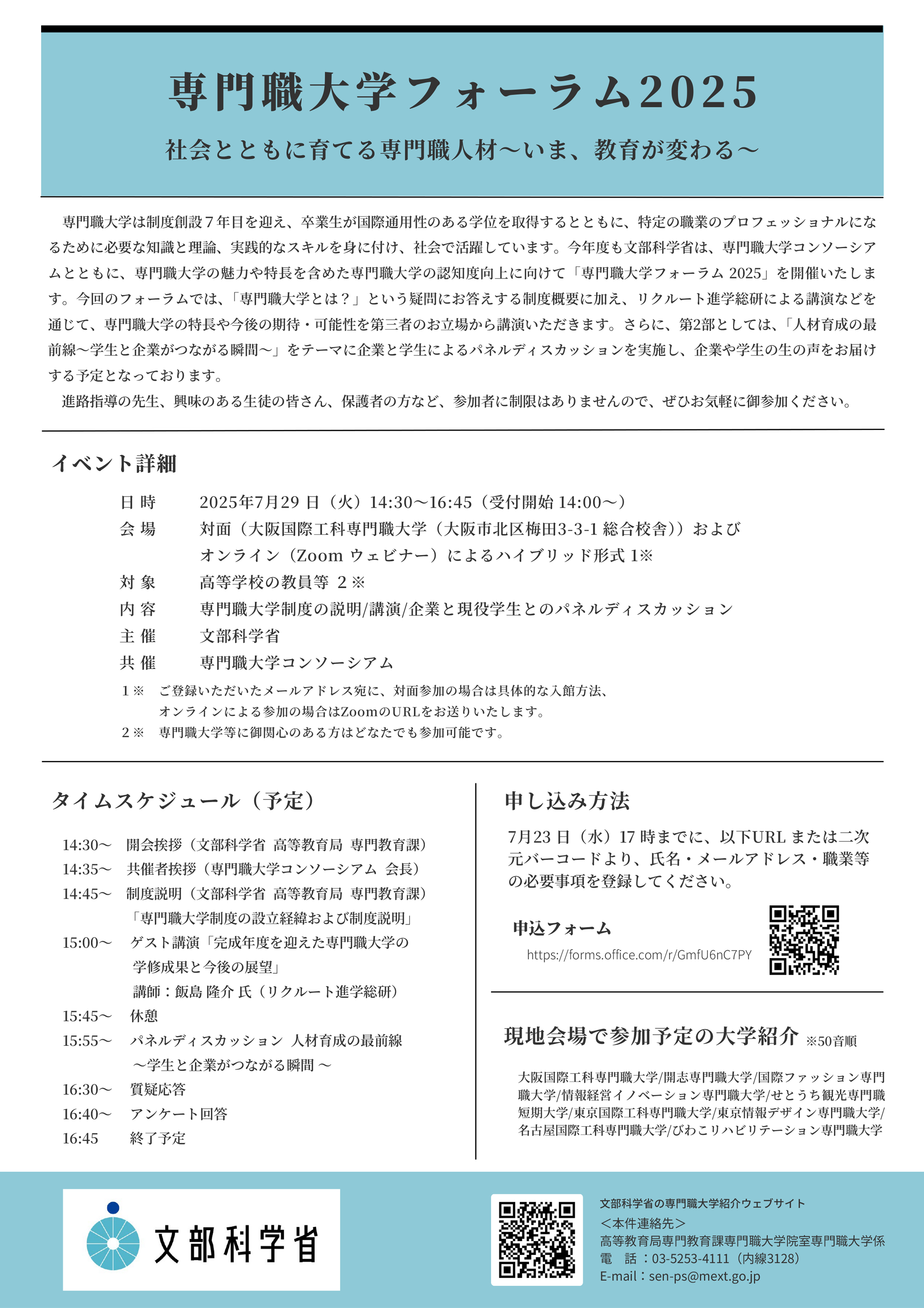 専⾨職⼤学は制度創設7年⽬を迎え、卒業生が国際通⽤性のある学位を取得するとともに、特定の職業のプロフェッショナルになるために必要な知識と理論、実践的なスキルを⾝に付け、社会で活躍しています。今年度も文部科学省は、専門職大学コンソーシアムとともに、専門職大学の魅力や特長を含めた専門職大学の認知度向上に向けて「専門職大学フォーラム 2025」を開催いたします。