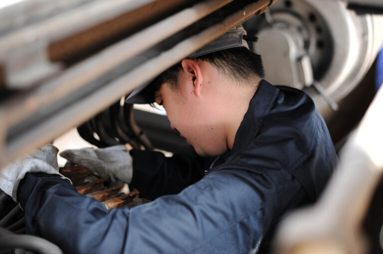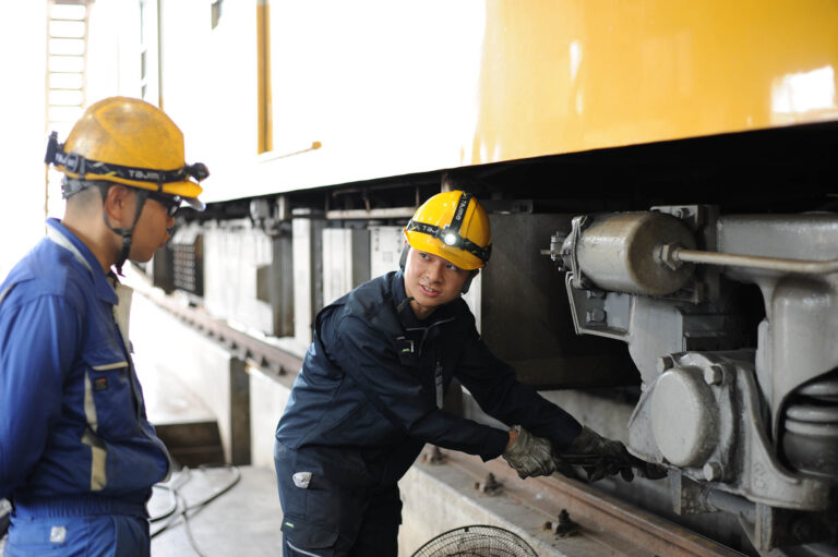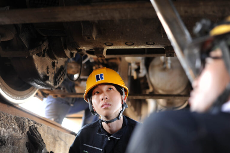 真夏日の検車庫で、体調に気を付けながら指導役の方と一緒に実車整備を行います。