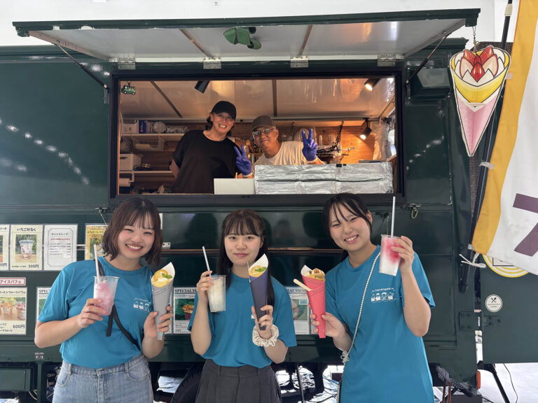 「食」と「観光」がテーマの今回、本学の学生と人気キッチンカーのコラボメニューの開発や、当日のイベントサポートを担当。多くのメディアに取材いただきました。