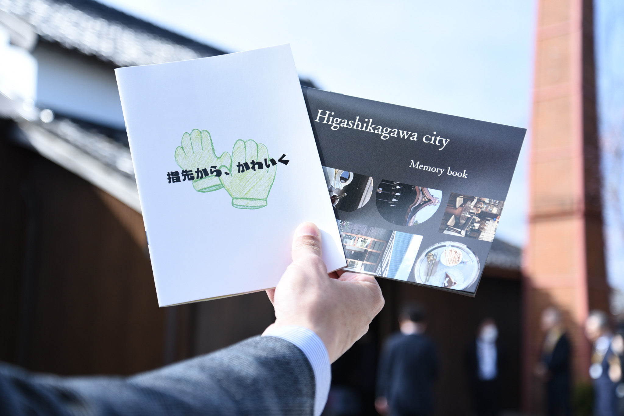 東かがわ市の観光・食事スポットをアルバム風に編集し、写真やコメントを加えて思い出に残るようなパンフレットや、ファッション雑誌風のデザインで東かがわ市が全国1位の生産を誇る手袋をPRしたパンフレットが完成しました。