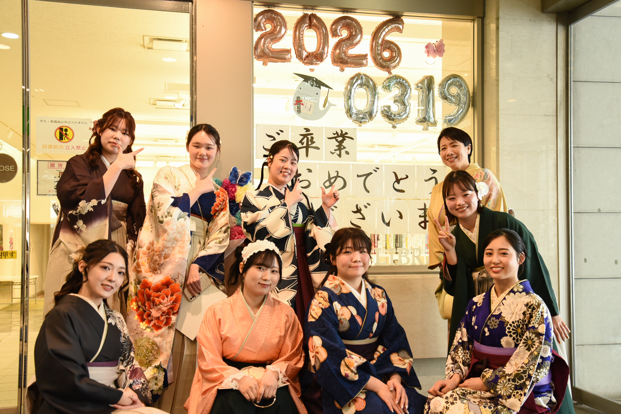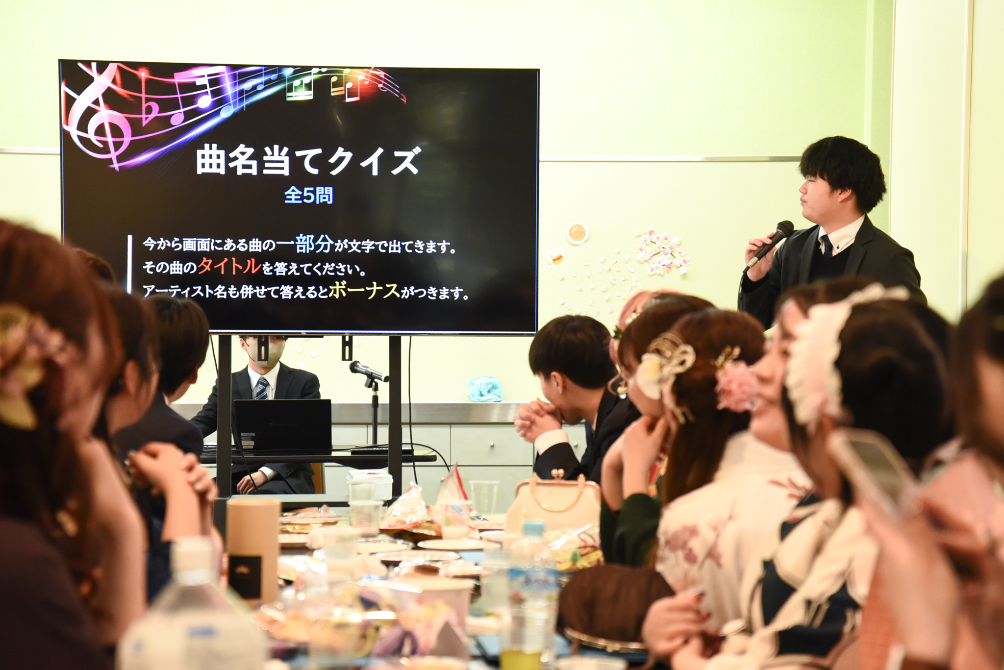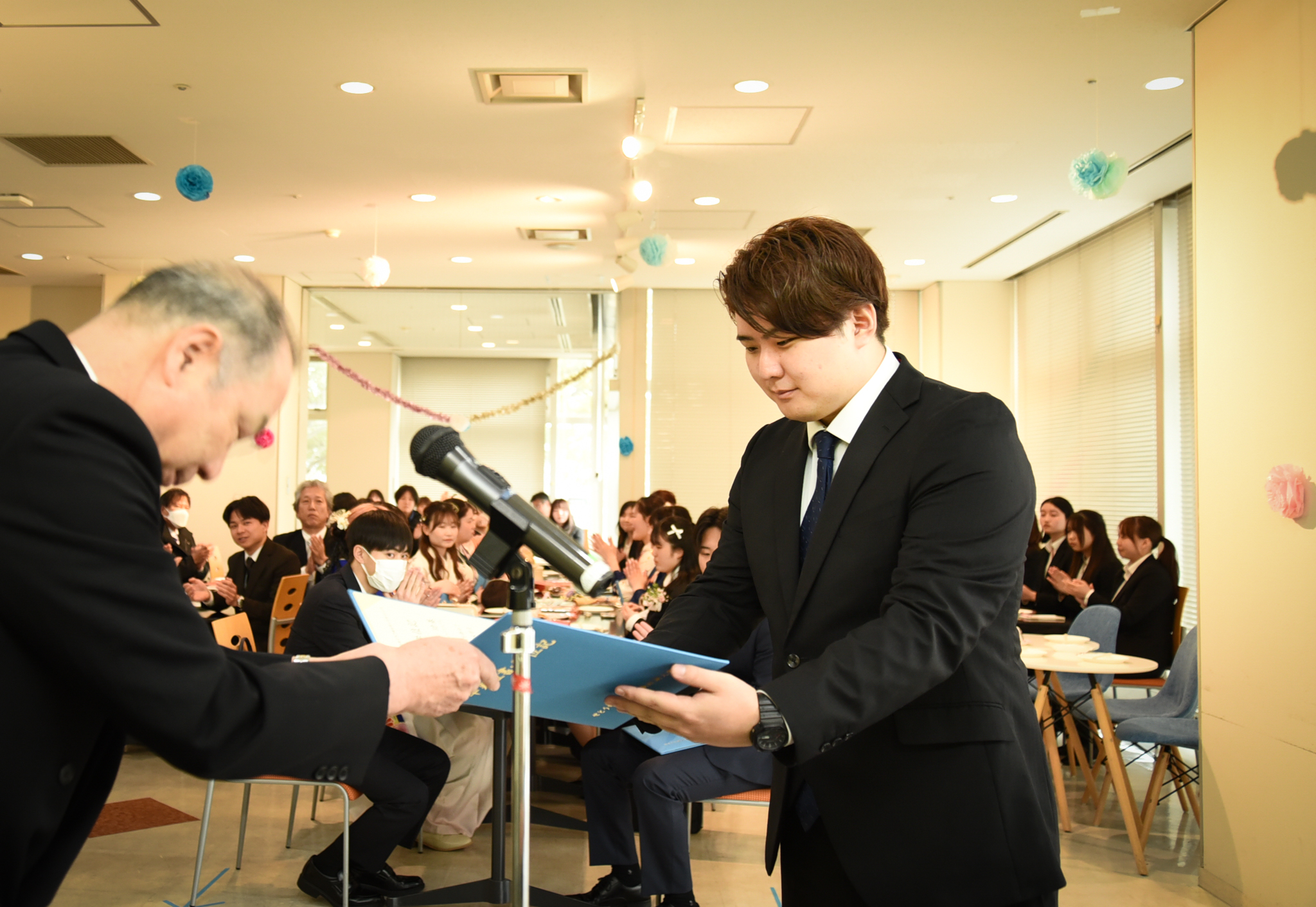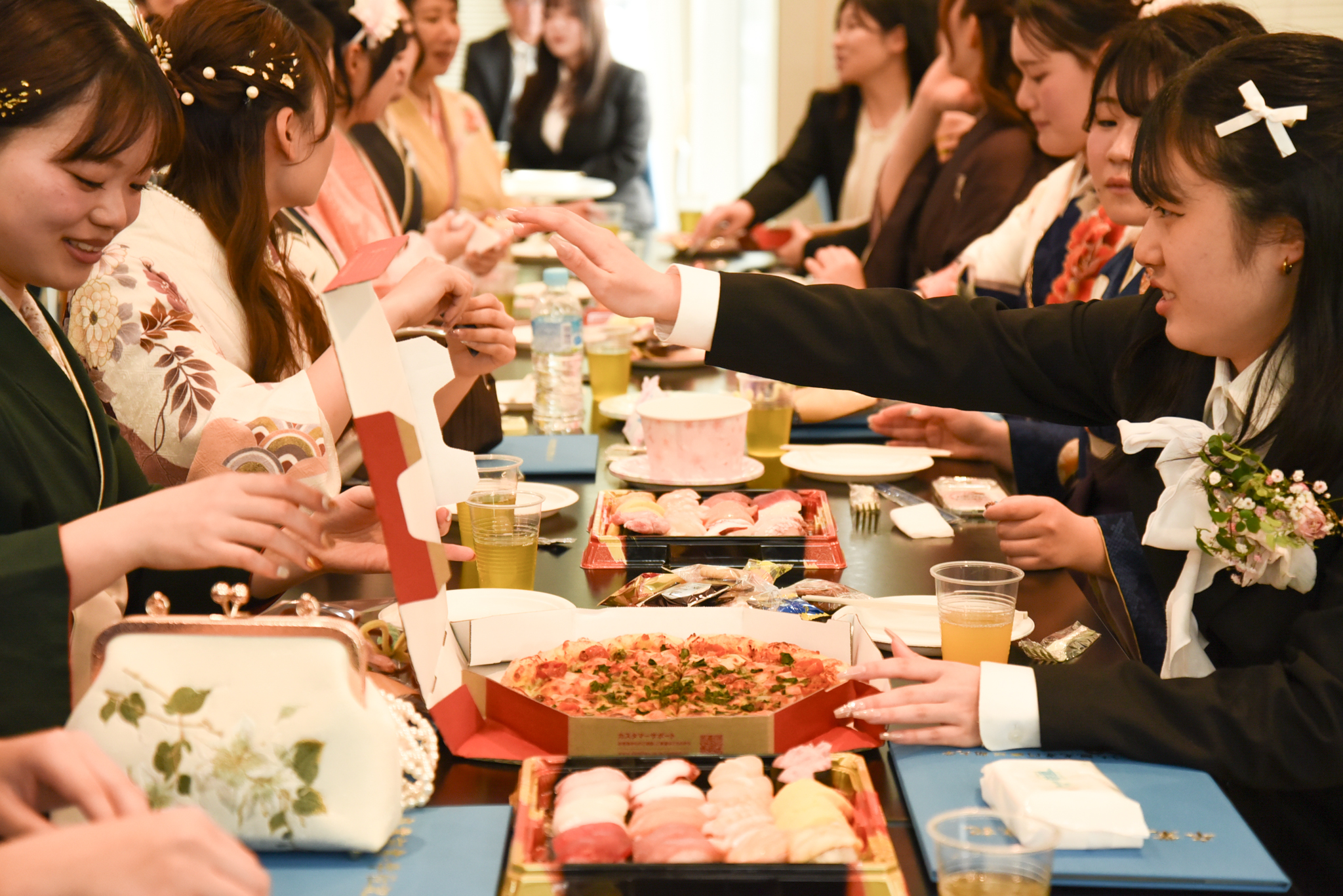 式の後には、学生交流委員による卒業記念パーティーが行われ、卒業証書の授与、クイズ・ビンゴ大会、卒業生へのメッセージが贈られ、学生生活の締めくくりとして、学生や教員と食事や歓談を楽しみ、思い出を共有して門出を祝いました。