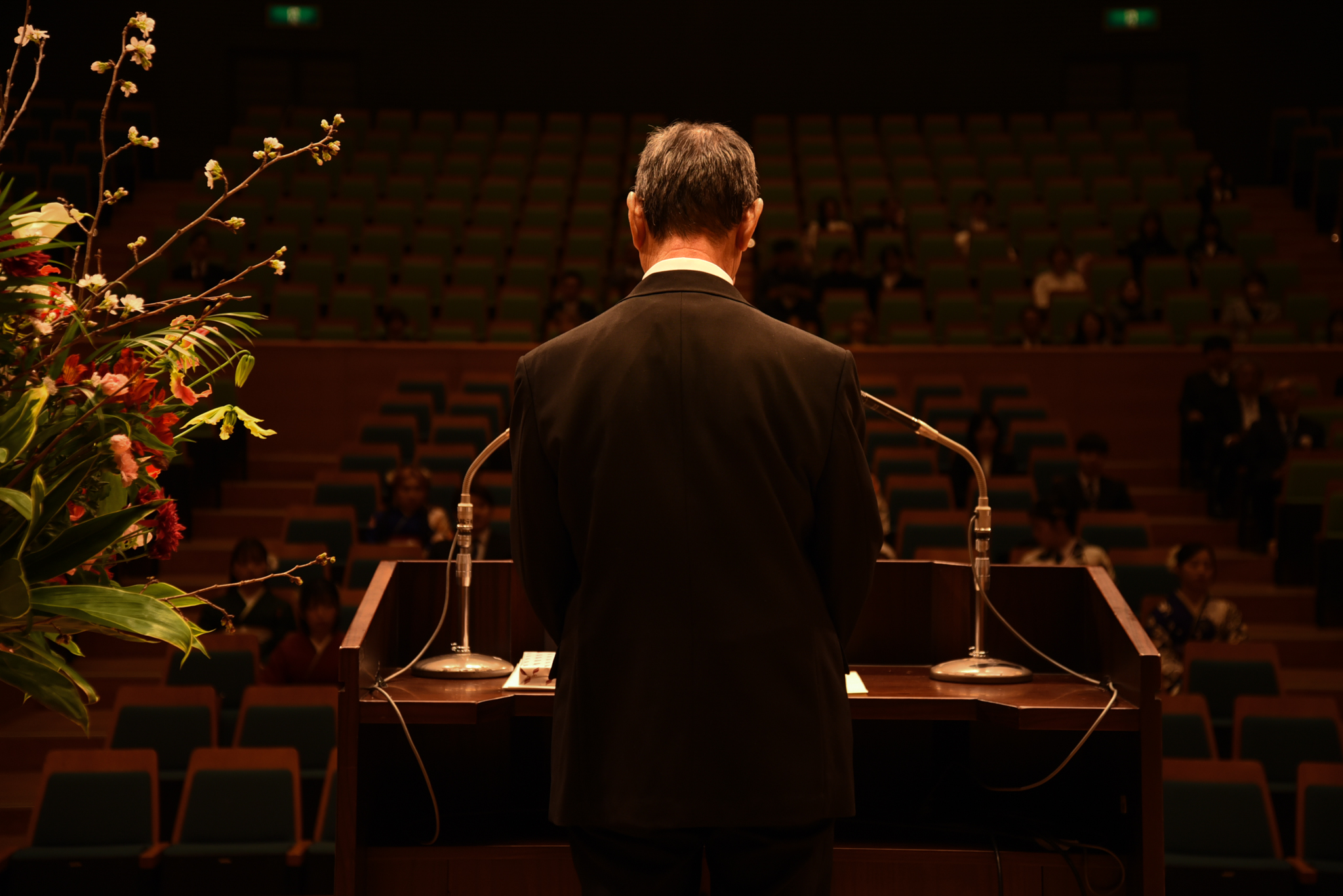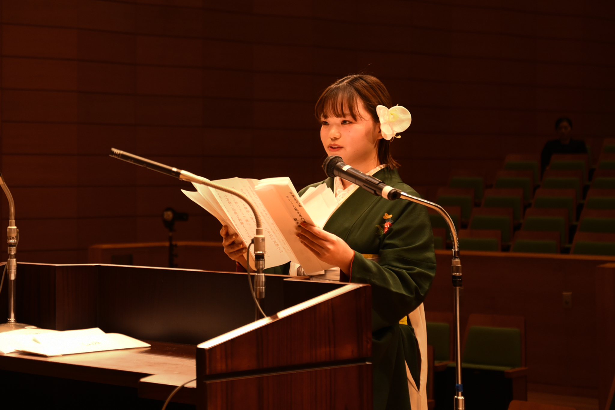 次に在校生を代表して、「青海波の模様がどこまでも途切れることなく続いていくように、皆様の歩む道が、平穏でありながらも、喜びに満ちた豊かなものであることを心より願っております。」と送辞があり、卒業生へ感謝や思い出、激励を伝えました。