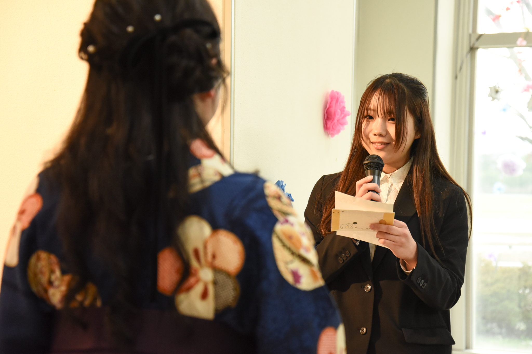 学長からは、「皆さんには卒業後も、”せと短”を一つの立ち帰るホームとして、何かがあればいつでも訪れてください。」「皆さんが自らの人生を自力で果敢に切り拓いていくことを期待します。」とお祝いの式辞がありました。